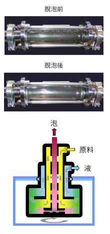 | 脫泡的原理 從泵送過來的原料 ( 液體 ) 供給到裝置后 , 通過在密封裝置內下部的轉子進行回轉 , 產生離心加速度 , 液相會被強烈推向離心方向的容器側面。被投入的原料 , 質量小的氣相 ( 含很多泡的部分 ) 會被集中到中央部和原料分離 , 這樣只有相成分在線送出。 |